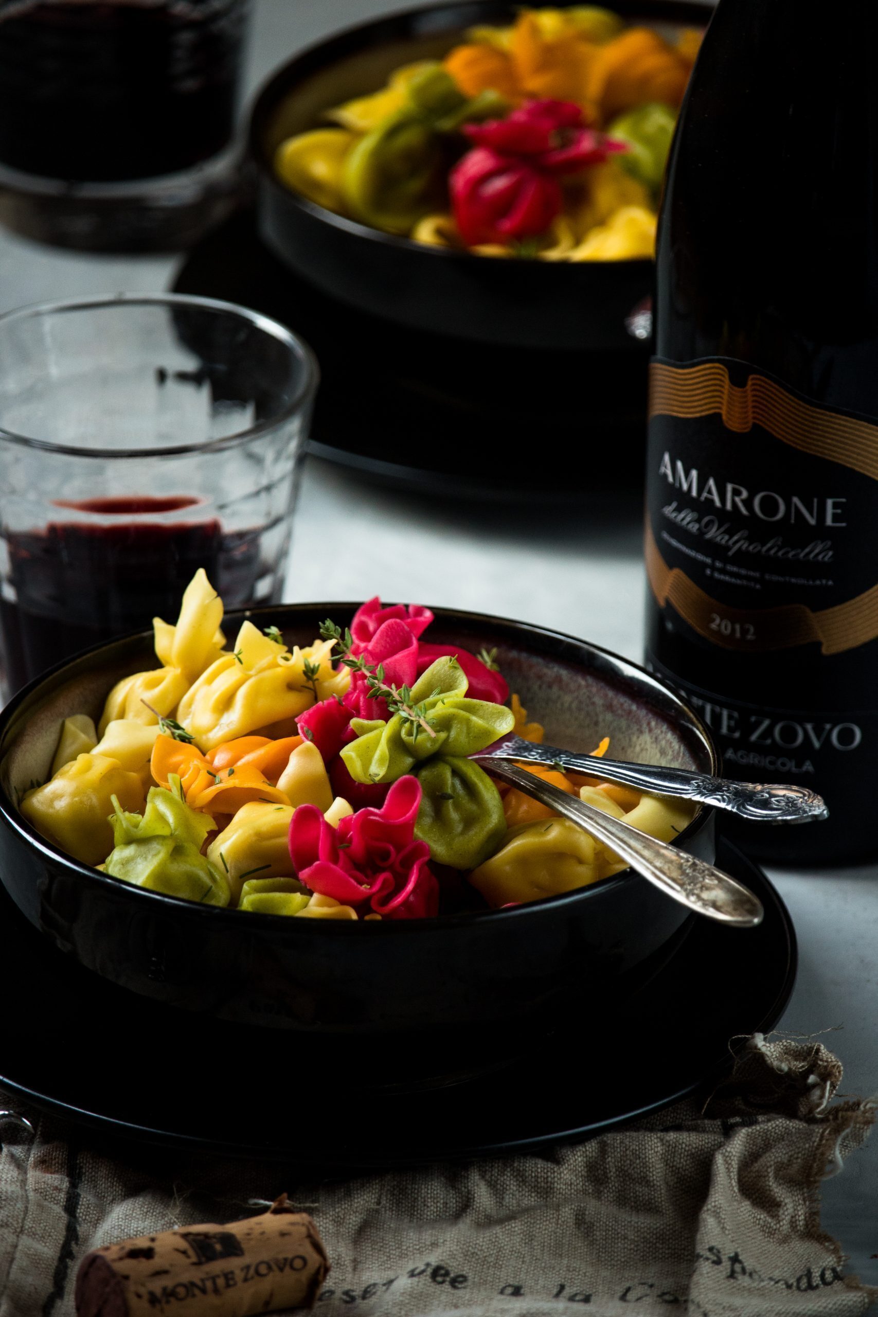 This quatro formaggi beggars purse makes a sensational plate presentation, filled with velvet ricotta, fresh mozzarella, parmesan, asiago, and romano cheeses.